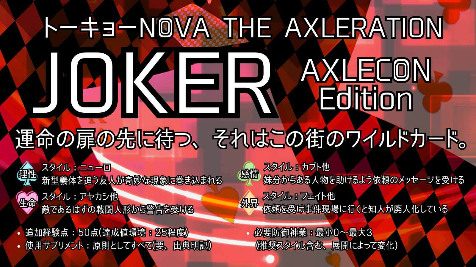 言い換えれば、本アクトをプレイするにあたり、トーキョーN◎VAの世界観をガチガチに理解することは求めておりません。できる限り参加の敷居を低くすることを目指しています。
